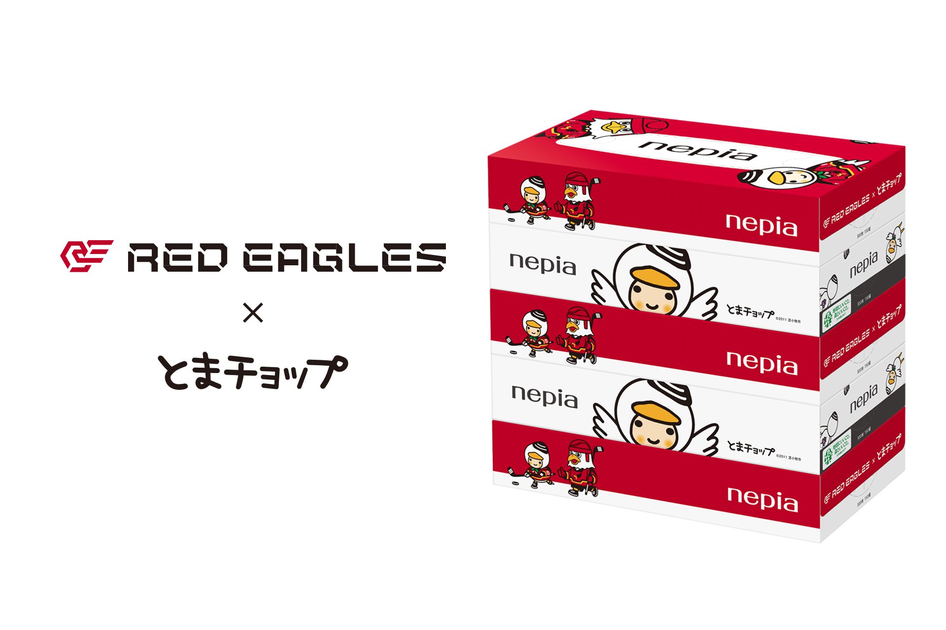 レッドイーグルス北海道×とまチョップ 苫小牧市ゆかりのキャラクターコラボティシュ。