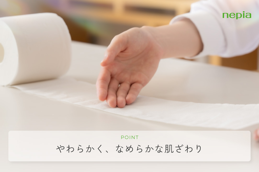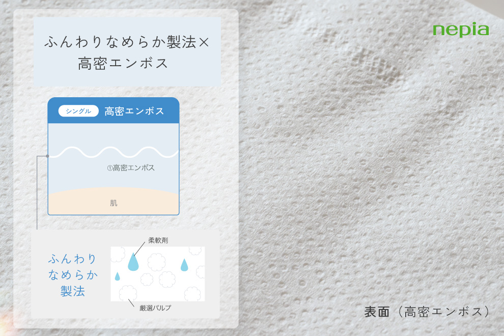 ふんわりなめらか製法に、独自の高密エンボス加工を掛け合わせることで、やわらかく「なめらかな」肌ざわりを実現しました。