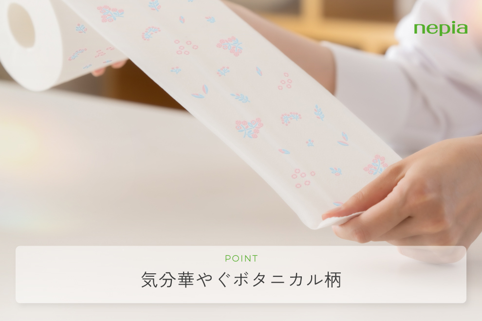 紙そのものの厚みを増やし、柔らかいパルプの比率をアップした厳選パルプに、柔軟剤を配合!丈夫でやぶれにくく、ふわっとプレミアムな肌ざわりです。