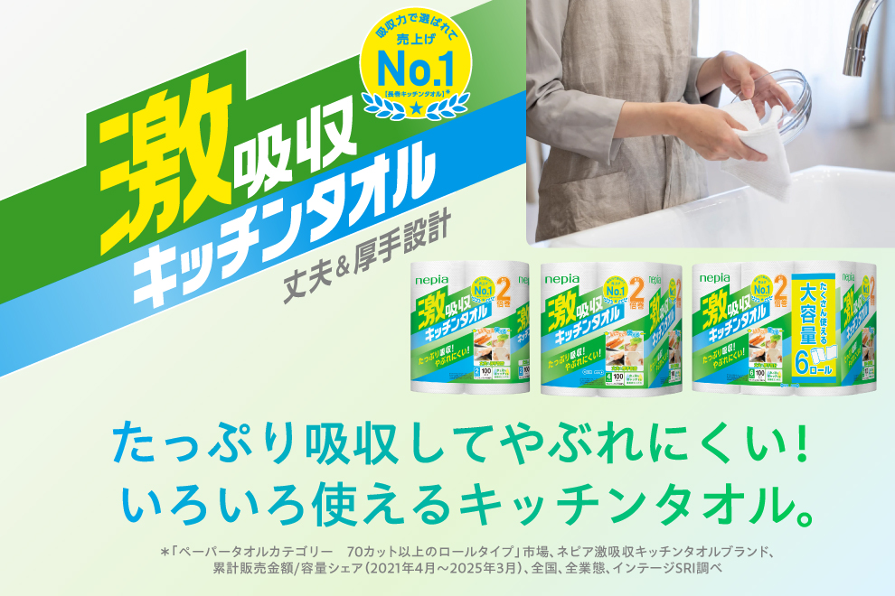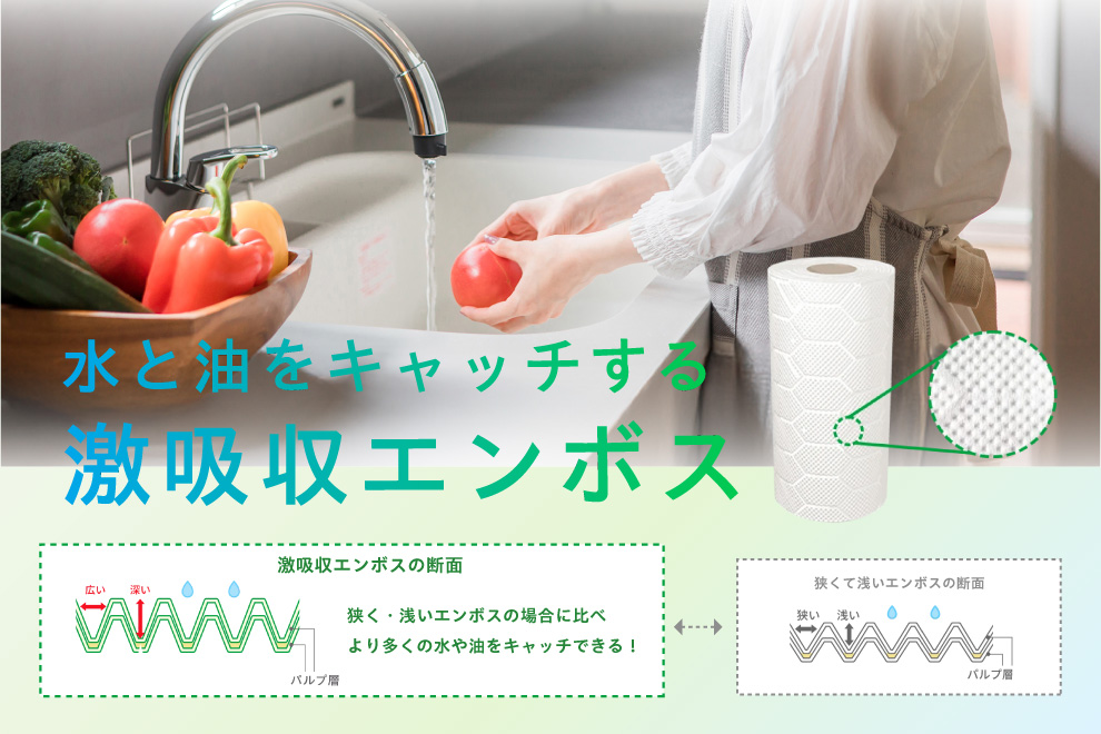 厳選したパルプ配合の「厚手&丈夫設計」と、深くて広い溝ができる「激吸収エンボス」加工で、水と油をたっぷり吸収してやぶれにくい。
