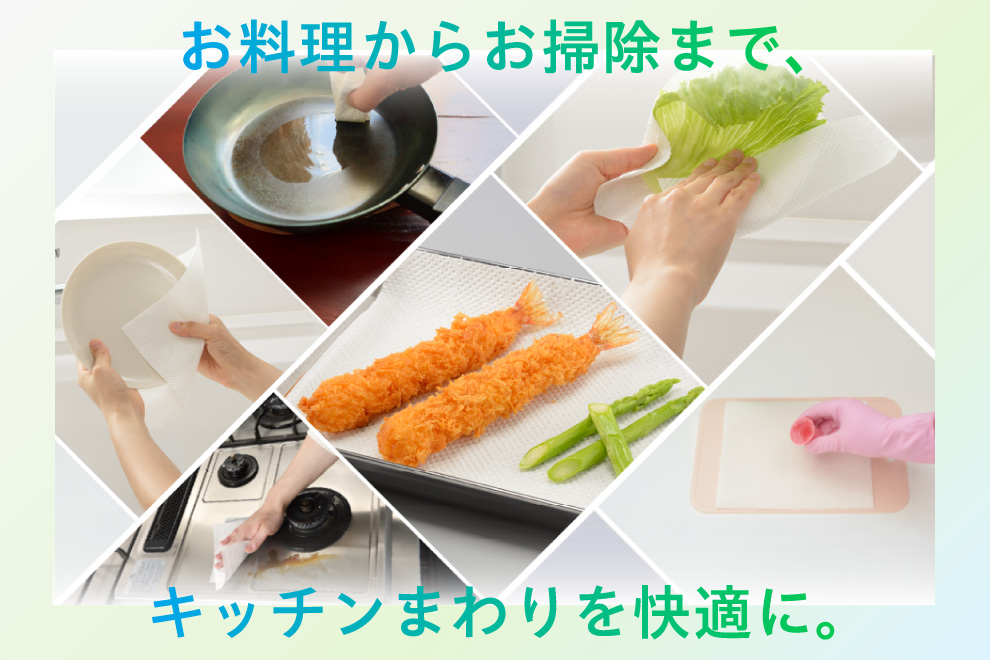 揚げ物の油切り、野菜の水切り、食器拭きやコンロ周りのお掃除など、お料理からお掃除まで、幅広い用途でご使用頂けます。